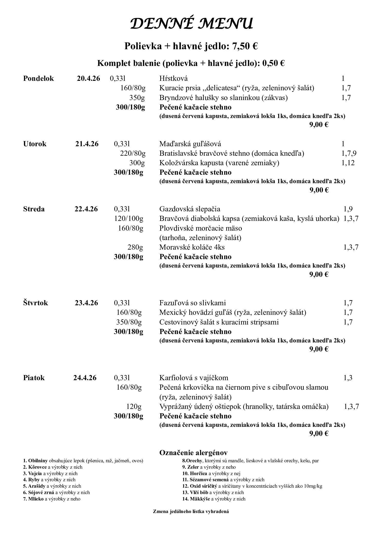 Ponuka reštaurácie platná od 20.04.2026 do 24.04.2026