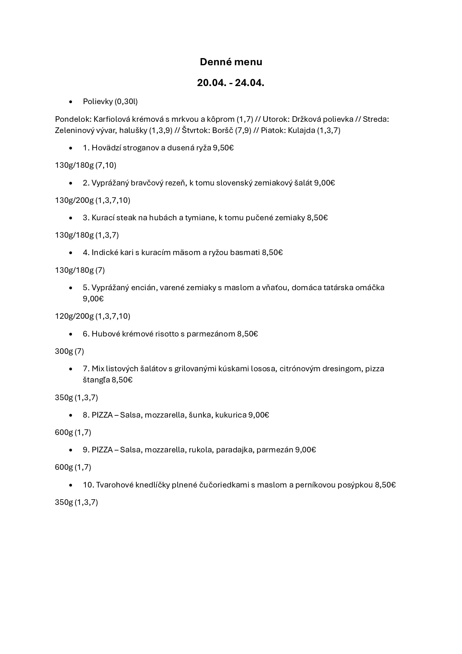 Ponuka reštaurácie platná od 20.04.2026 do 24.04.2026