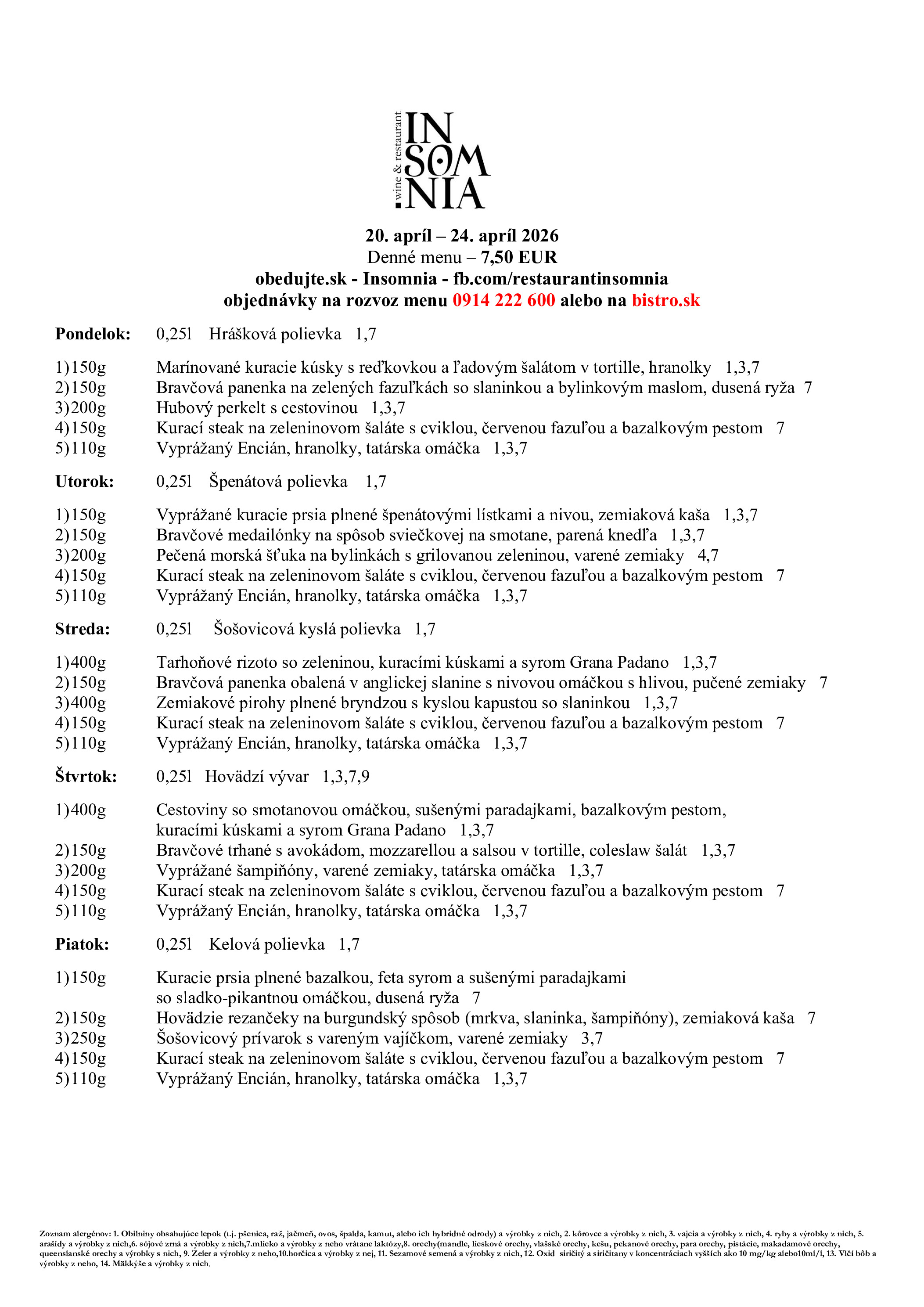Ponuka reštaurácie platná od 13.04.2026 do 17.04.2026